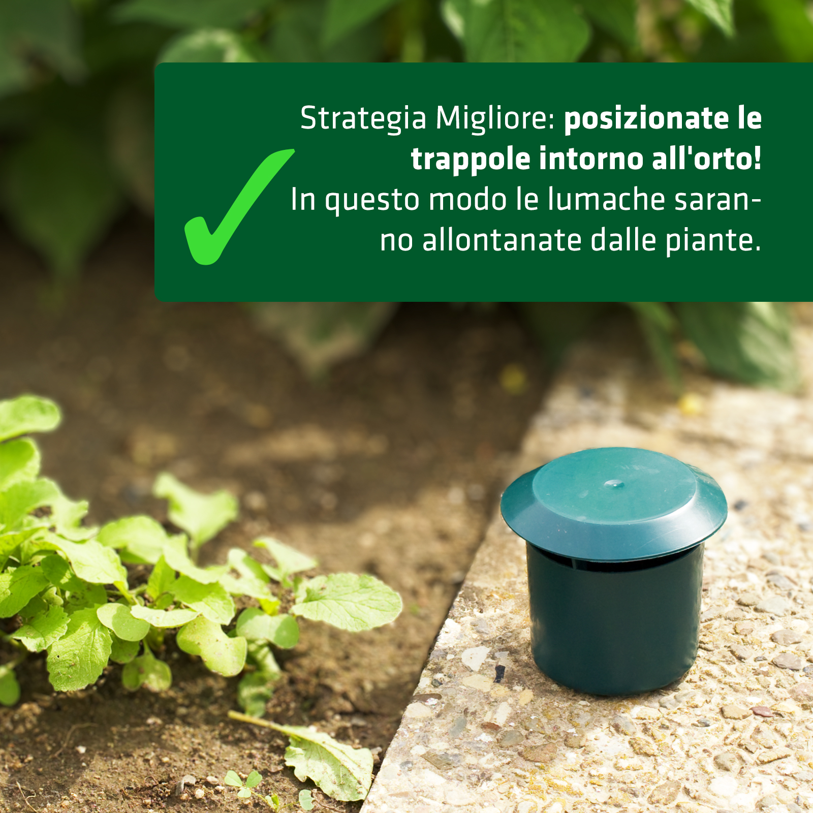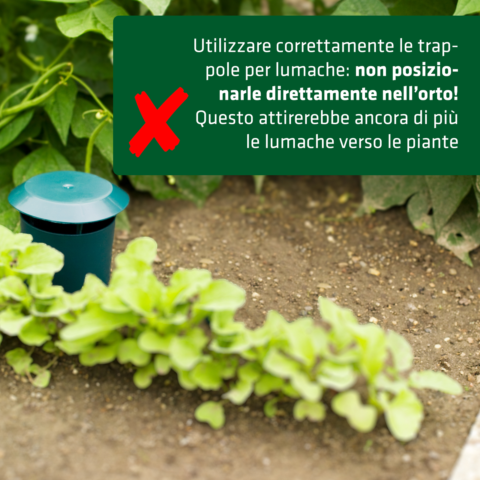 Potete anche interrare le trappole. La fessura sotto il coperchio è abbastanza stretta da impedire alle lumache adulte di passare. Questo è importante perché non sono considerate infestanti del giardino.