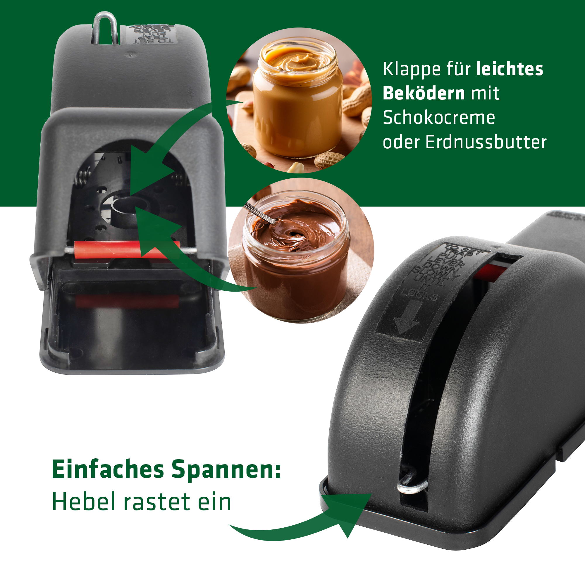 Per aggiungere l’esca, apri lo sportello anteriore. Per questo tipo di trappole sono ideali esche spalmabili come crema di nocciole o burro di arachidi.