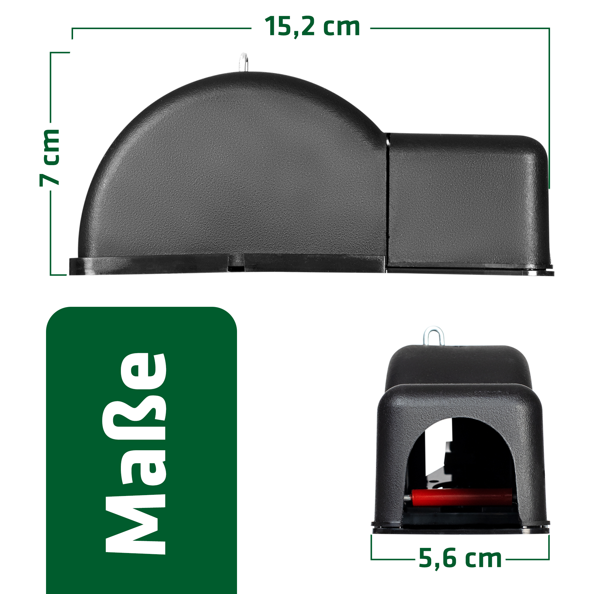 La posizione della leva di tensione indica se la trappola è scattata. I topi intrappolati possono essere rimossi dalla trappola senza toccarli, premendo nuovamente la leva. La trappola per topi è realizzata in plastica. Questo la rende facile da pulire e da utilizzare più volte.