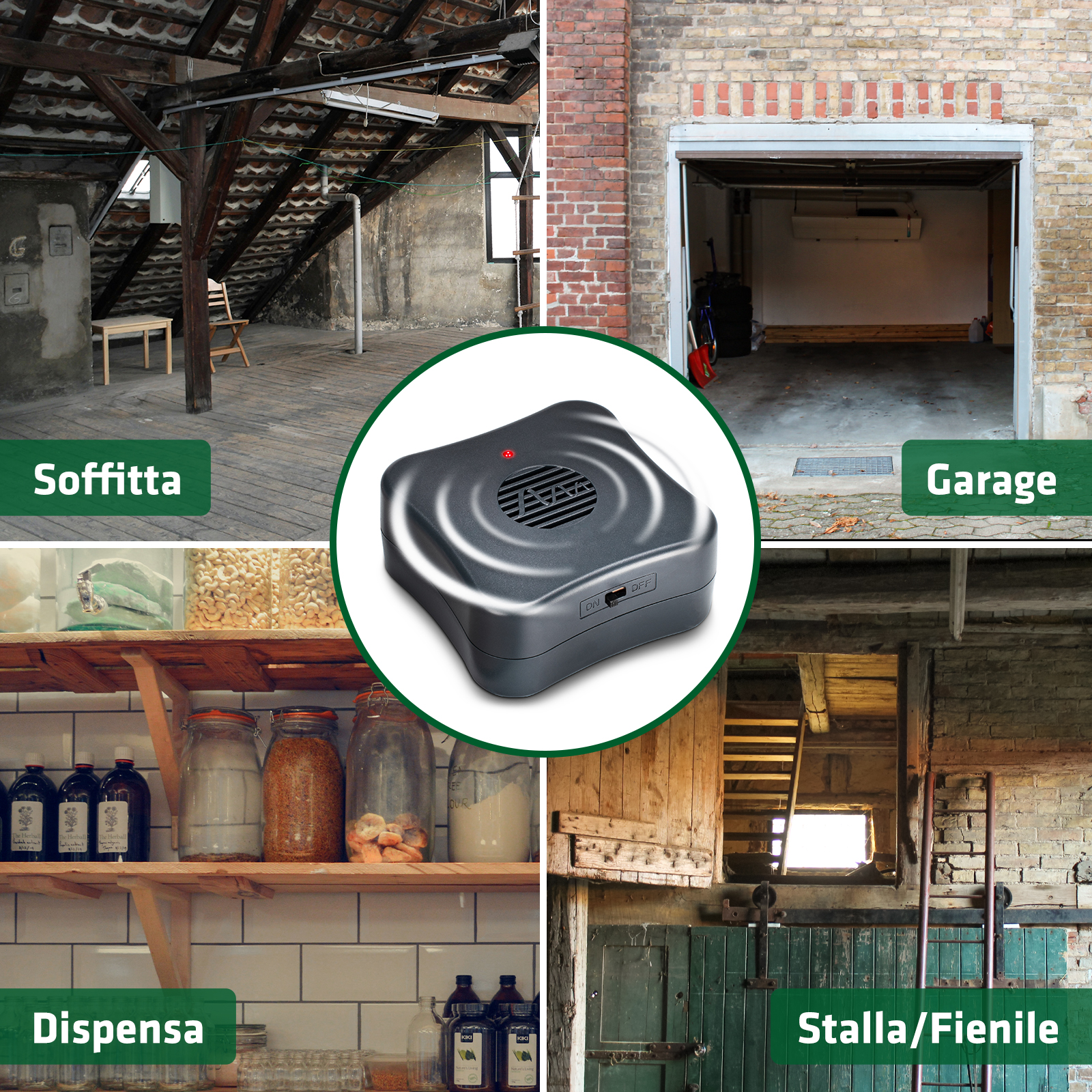 Poiché il dissuasore per topi è alimentato a batterie, non necessita di prese di corrente e può essere utilizzato ovunque vi siano problemi con i topi, ad esempio in soffitta, in cantina, in garage o nel deposito in giardino.