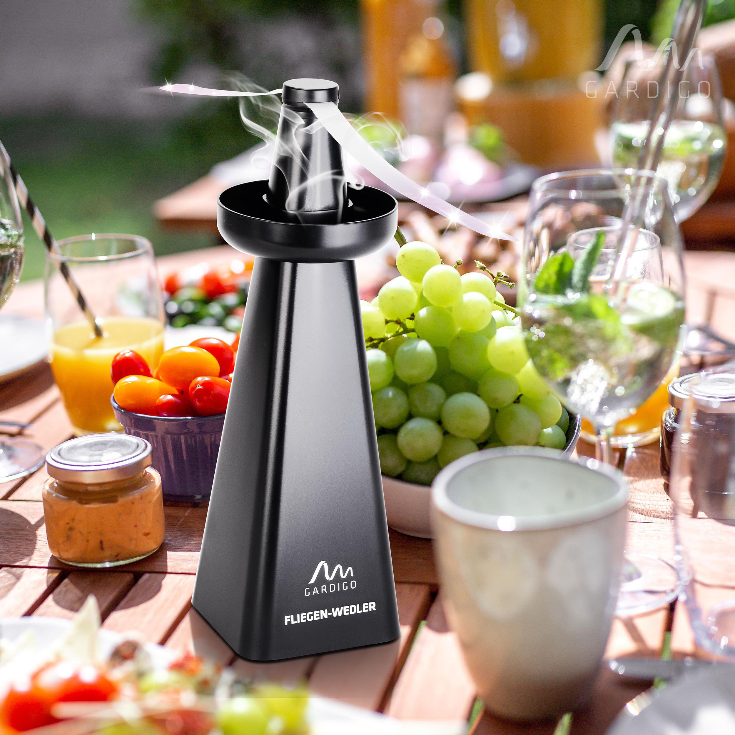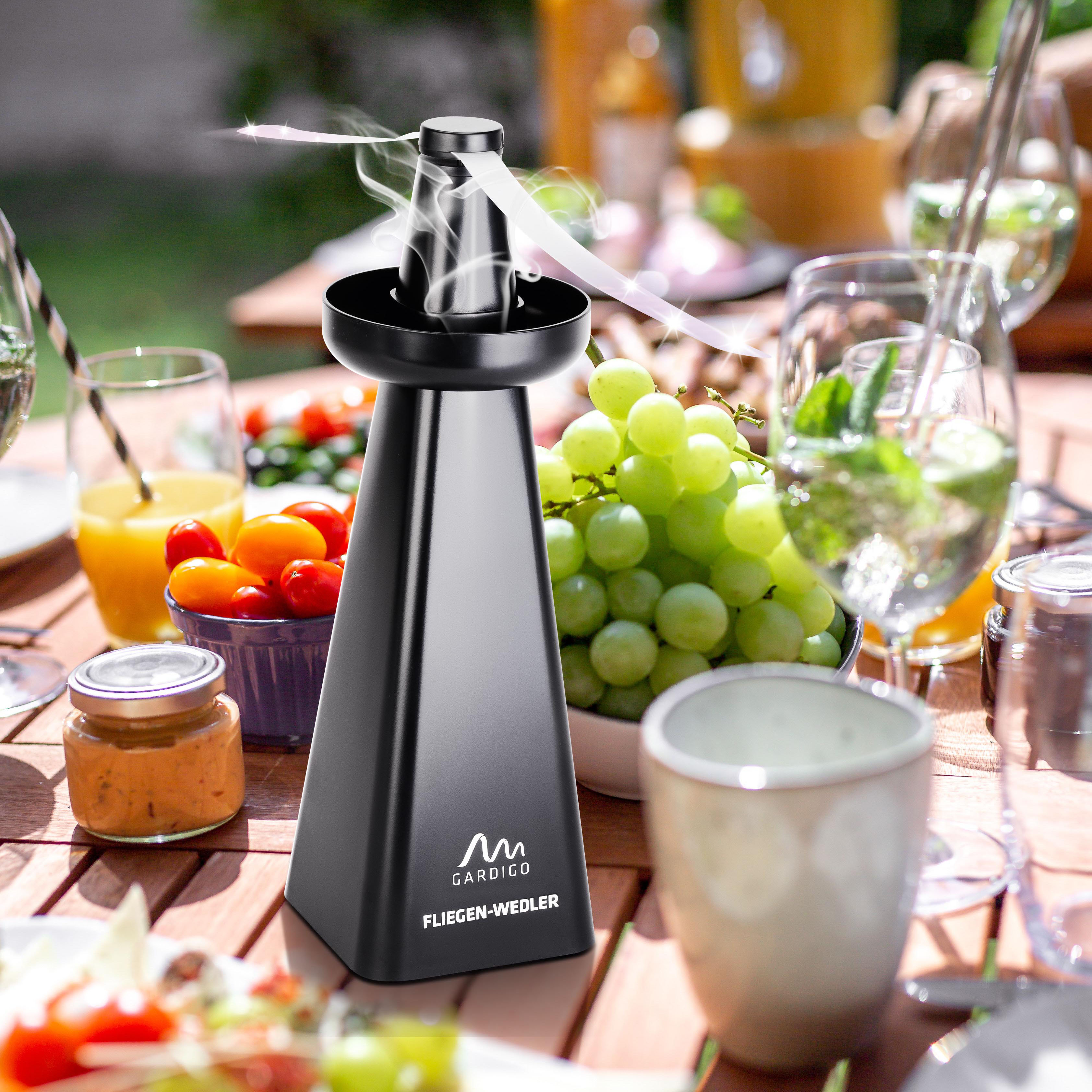 Il nostro scacciamosche è dotato di ali rotanti per tenere lontani i fastidiosi insetti da cibo e bevande, senza l’uso di sostanze chimiche aggressive. Ma non è tutto: con la ciotola in dotazione, ora potete anche respingere le vespe in modo naturale. È sufficiente aggiungere alcune gocce di olio essenziale, come quello di menta piperita o di eucalipto (non inclusi), nella ciotola e aggiungere acqua. Le vespe eviteranno l’area con questi odori. Sarete di nuovo indisturbati!