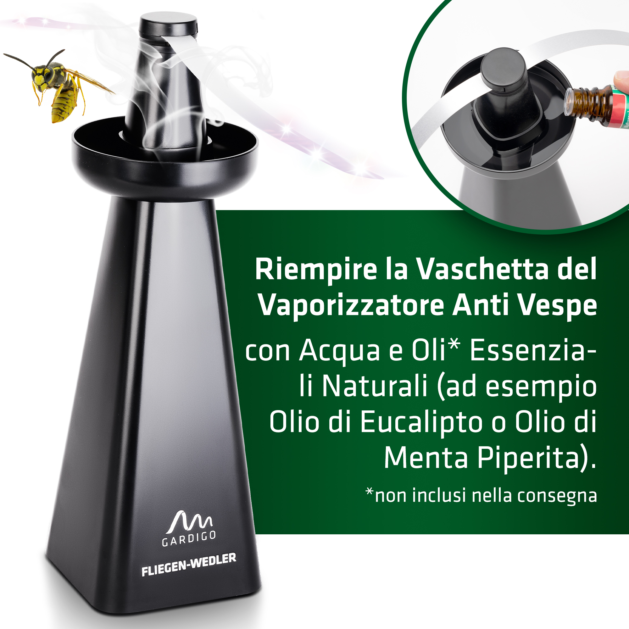 L’esclusiva ciotolina inclusa per oli essenziali trasforma il repellente per mosche in un repellente per vespe. Basta con i fastidiosi ronzii e le punture: respingete mosche e vespe in modo delicato ed efficace!