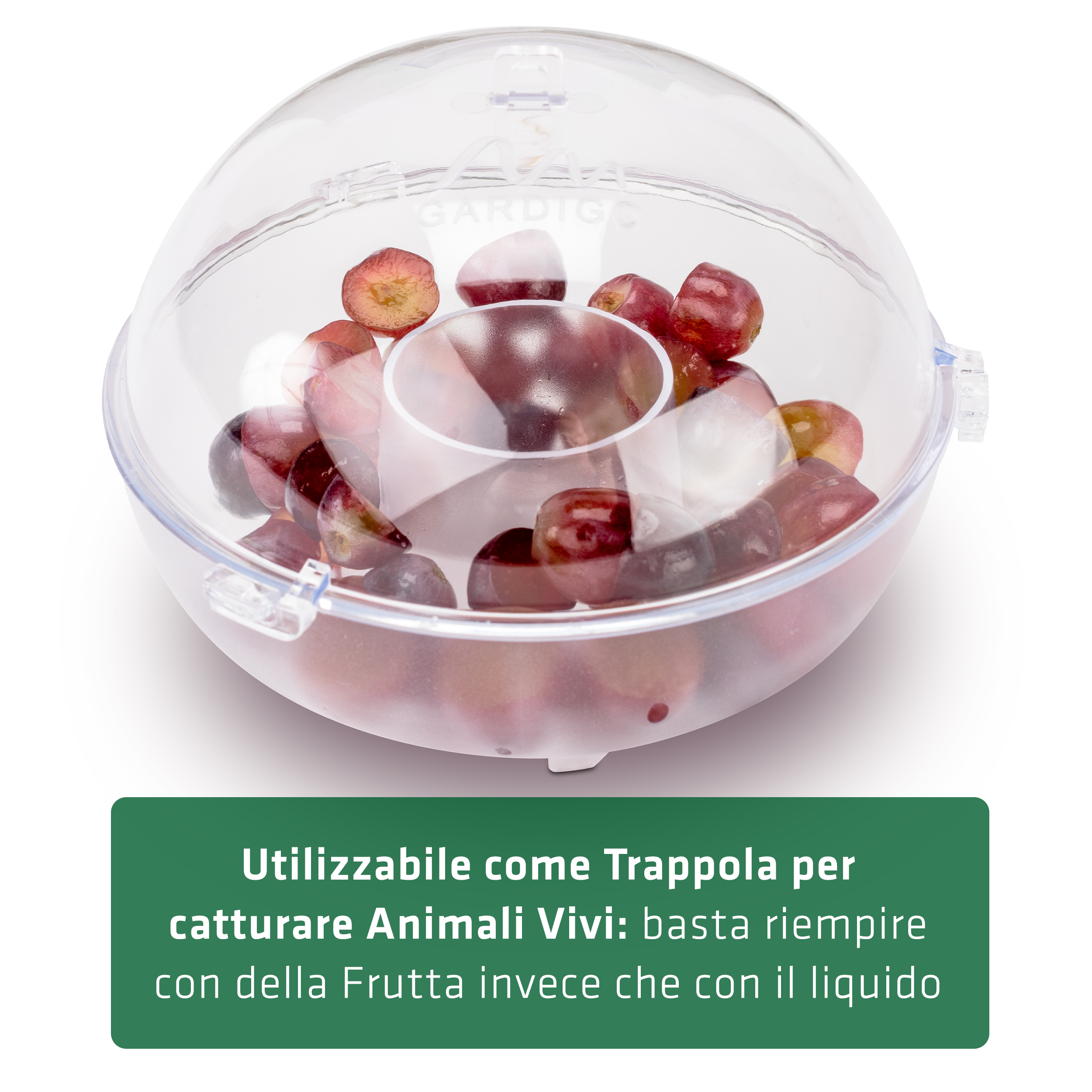 La trappola per vespe offre due modalità d’uso: cattura viva con frutta fresca come esca o cattura letale con una soluzione liquida zuccherina (aceto + succo di frutta, ecc.)