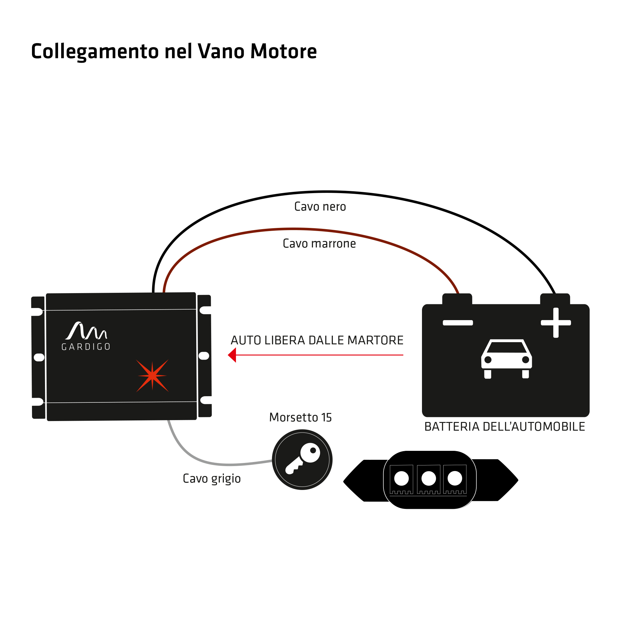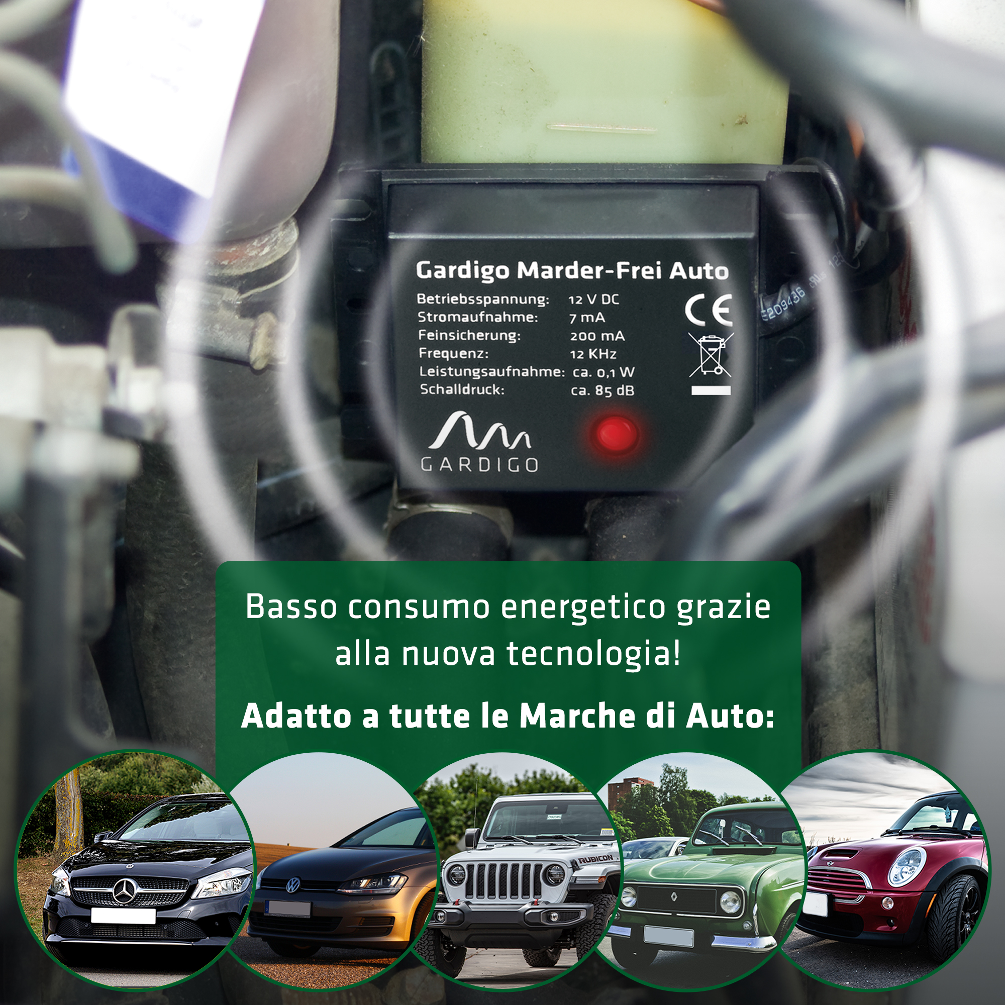 Il dissuasore anti martore è il repellente per martore classico per il vano motore di GARDIGO. Il dispositivo emette suoni ad alta frequenza che disturbano gli animali.