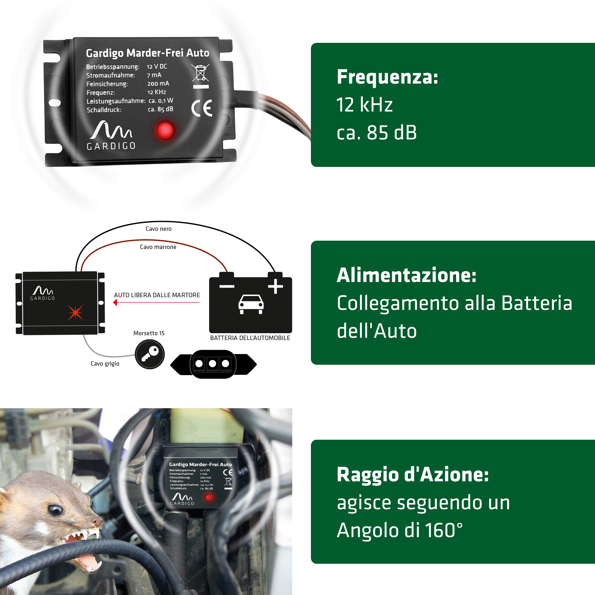 Info sui prodotti "Repellente Anti Martore per Auto | Ultrasuoni contro le Martore con Collegamento Batteria Auto"