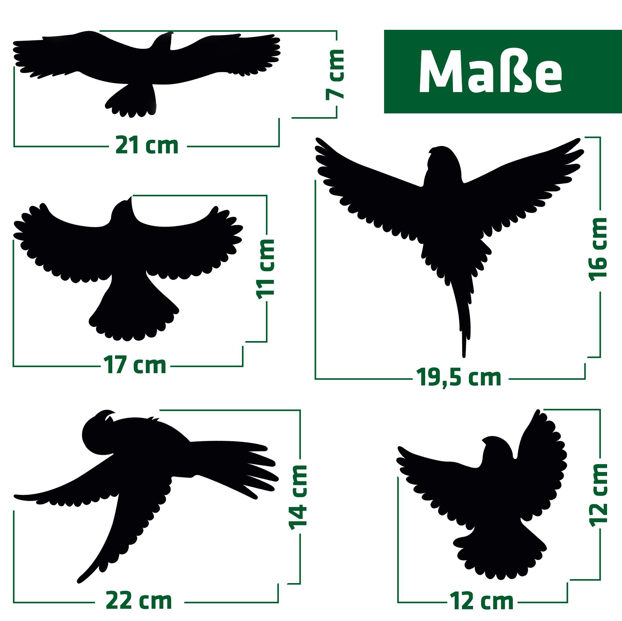Dimensioni: 5 uccelli da 11 x 11 cm a 12,5 x 20 cm (L x A)