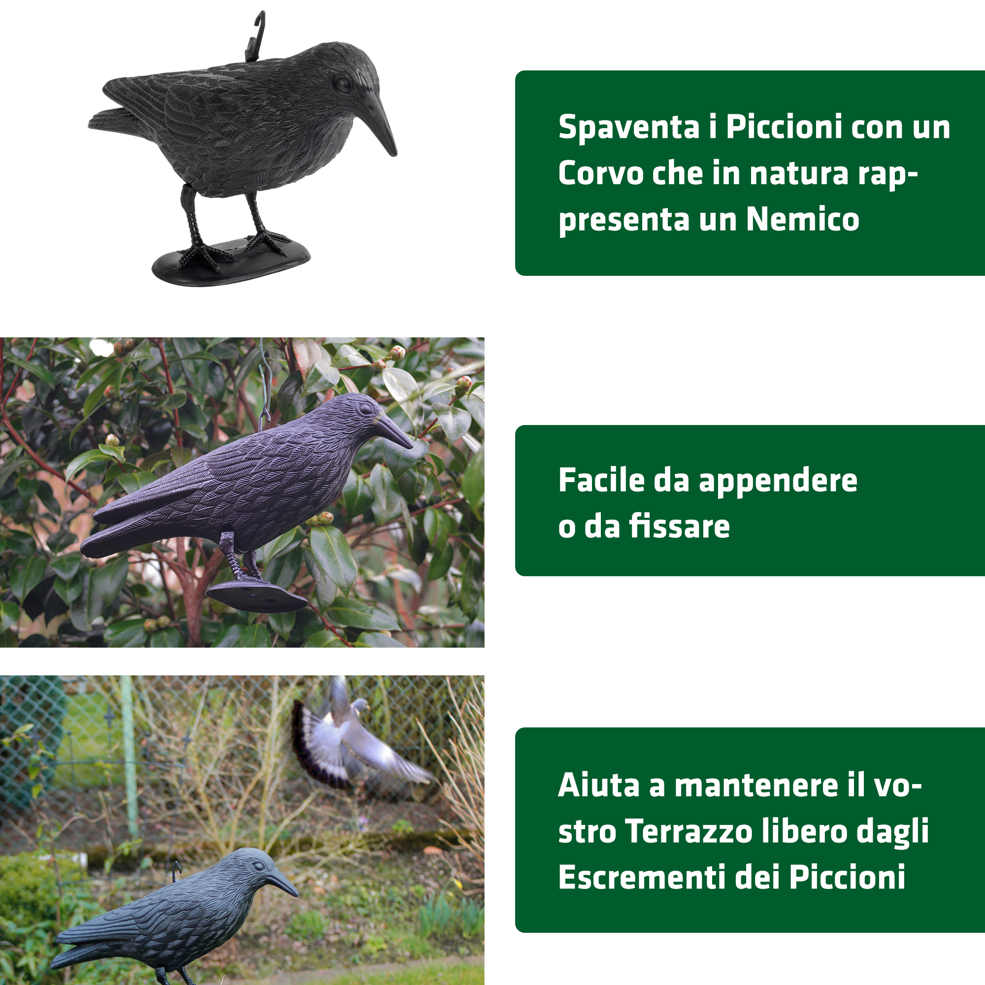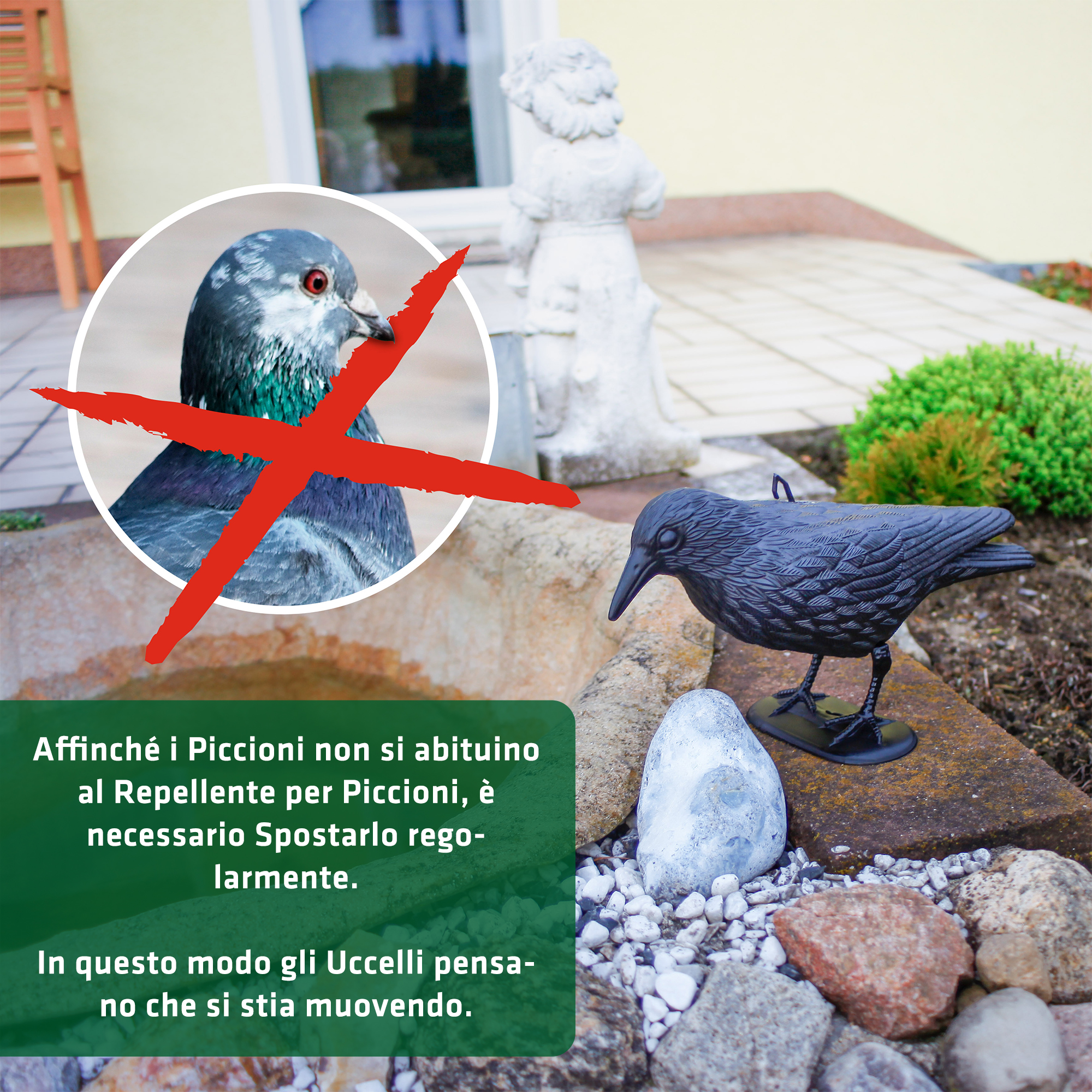 Il repellente per piccioni GARDIGO, a forma di corvo realistico, sfrutta l’istinto naturale dei piccioni: questi uccelli percepiscono corvi e cornacchie come predatori e tendono a evitarli. Posizionato bene, il corvo induce i piccioni ad abbandonare la zona nel tempo. Il dissuasore per piccioni è facile da posizionare e spostare. Il prodotto include un gancio per appenderlo (es. con filo di nylon), un picchetto da giardino per il fissaggio in terra o in vaso e fori predisposti alla base e sul dorso per montaggio flessibile. Il massimo effetto deterrente si ottiene appendendolo a un filo sottile, in modo che oscilli con il vento. Si consiglia di spostare regolarmente la posizione della sagoma per evitare che i piccioni si abituino e di usarla in modo continuativo per risultati prolungati nel tempo.